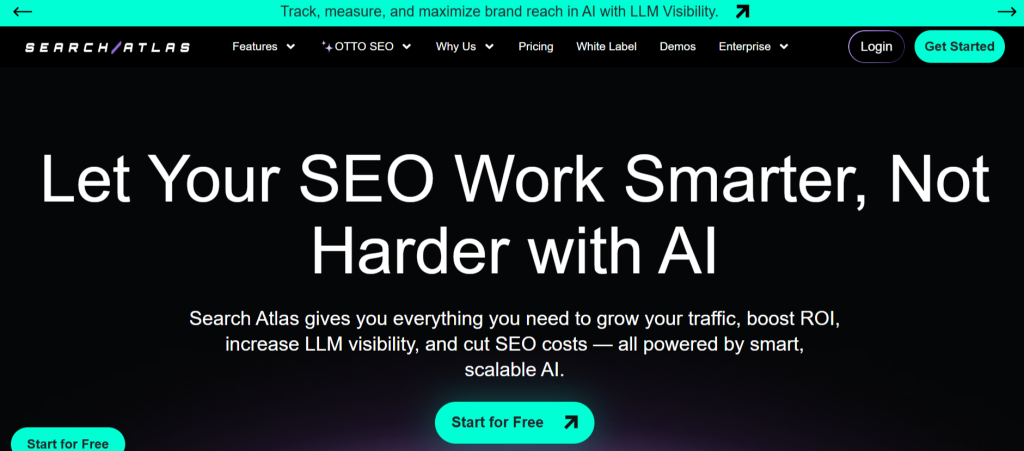 Search Atlas positions itself as the premier all-in-one AI SEO platform with exceptional LLM visibility tracking and comprehensive optimization capabilities. The platform integrates advanced AI across keyword research, content generation, competitor analysis, backlink monitoring, and performance analytics, providing unified workflows that eliminate the need for multiple specialized tools.
