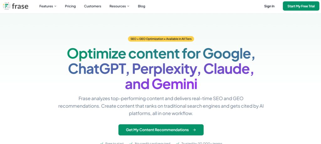 Frase streamlines the content creation workflow by automating research, generating optimized briefs, and providing real-time optimization as you write. The platform analyzes top-ranking pages for any keyword and extracts the topics, questions, and semantic elements that earn high positions, then packages that intelligence into actionable content briefs.